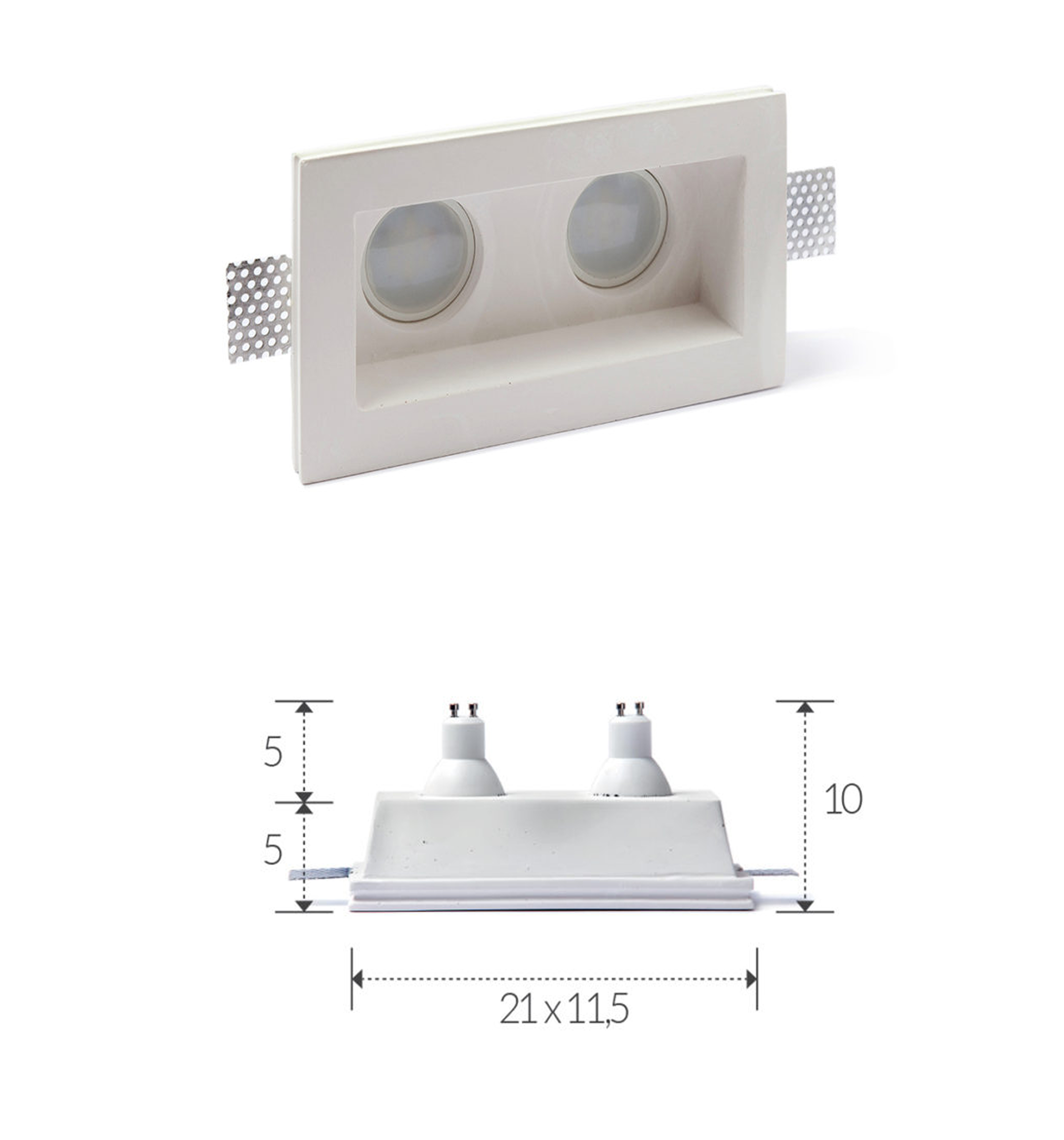ALG SPOT GIPSI është një trup ndriçues inkaso me dizajn drejtkëndor dhe dy llampa, i projektuar për instalim në mur ose tavan gipsi, duke ofruar një zgjidhje moderne dhe funksionale për ndriçim të brendshëm. Materiali prej allçie siguron një përfundim të pastër dhe mund të lyhet sipas ambientit për integrim perfekt vizual.